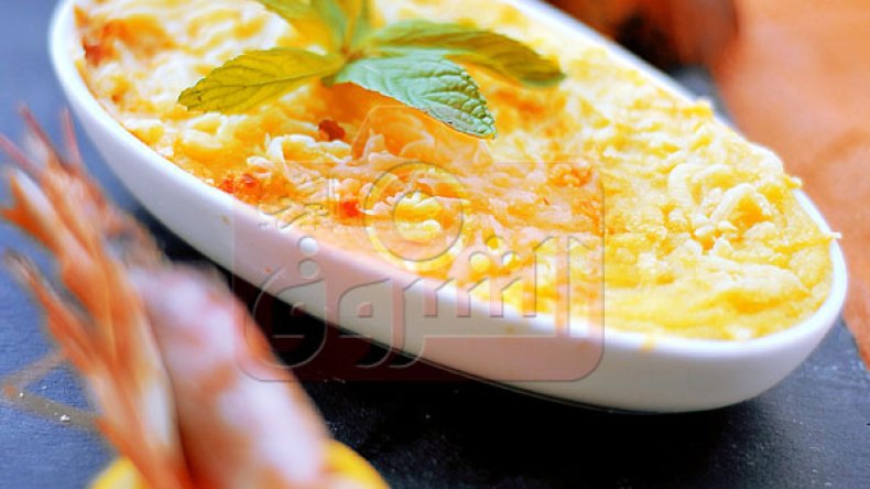 المقادير:-250غ جمبري crevettes منزوعة القشرة-50غ زبدة -50غ فرينة -نصف لتر حليب -ملح وفلفل أسود -جوزة الطيب -50غ جبن أبيض -جبن مبشور