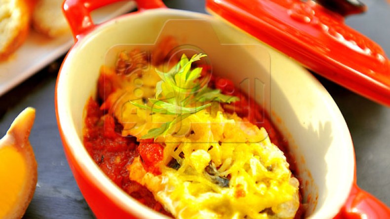 وداخل طبق مقاوم لحرارة الفرن ضعي طبقة من السمك وفوقها طبقة من السبانخ الممزوجة بالفطر، ثم طبقة من صلصة الطماطم مع ترك كمية للتقديم وفي الأخير أضيفي طبقة من السردين والكمية المتبقية من الجبن المبشور وأدخليه الفرن 180 درجة لمدة 5 دقائق.