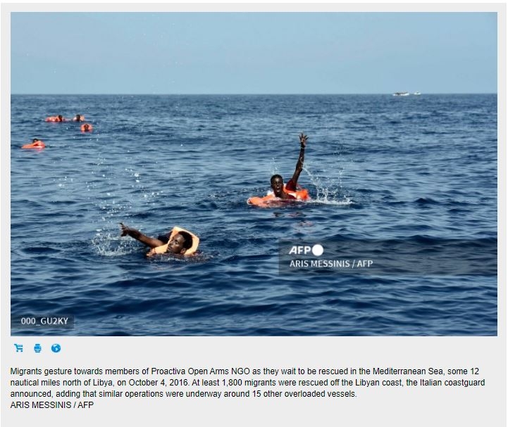 الصورة الأولى لمهاجرين في البحر المتوسط قبالة سواحل ليبيا، التقطت في الرابع من أكتوبر 2016.