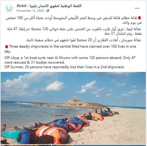 أما الصورة الأخيرة فمنشورة على صفحة عبر موقع فيسبوك في نوفمبر 2020 على أنها لمهاجرين قضوا غرقاً في البحر المتوسّط.