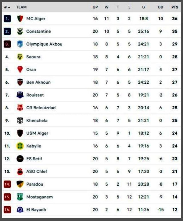 وتشكّل جدول الترتيب كالتالي: