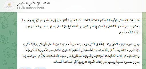 أكد المكتب الإعلامي الحكومي الفلسطيني أن الخسائر الأولية المباشرة في 15 قطاعًا حيويًا تجاوزت 70 مليار دولار، وفق بيان رسمي صدر بمناسبة مرور عامين منذ بداية العدوان الصهيوني على غزة، مشيرًا إلى أن الرقم يشمل أضرارًا جسيمة في البنى التحتية السكنية والصحية والتعليمية والزراعية وغيرها خلفها المستدمر الصهيوني على غزة.