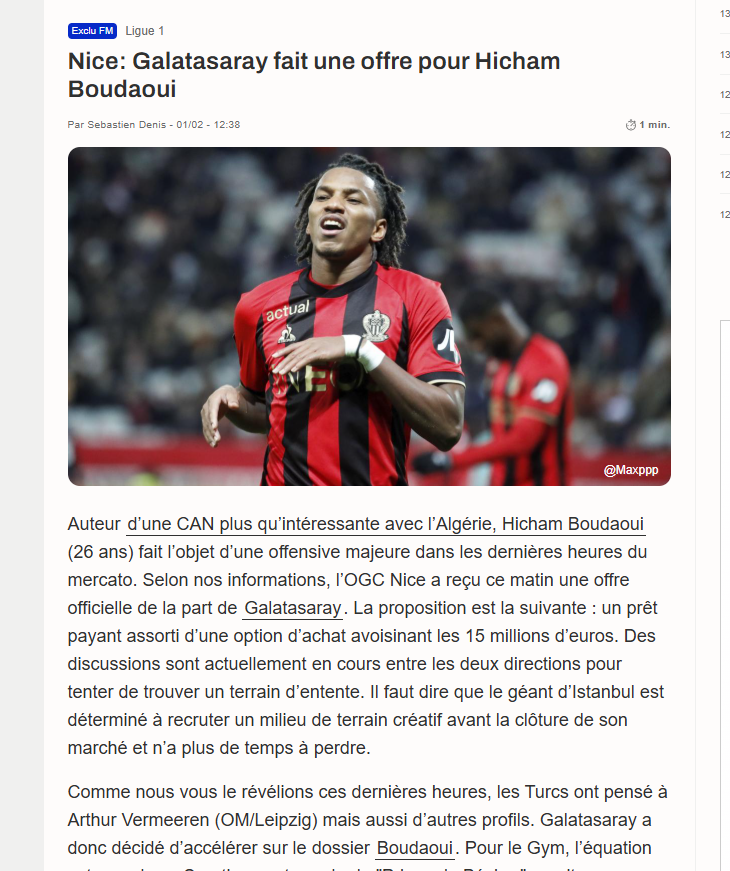 أكدت تقارير إعلامية أن نادي غلطة سراي التركي قدم عرضا رسميا لنادي نيس، من أجل الاستفادة من خدمات متوسط الميدان الجزائري، هشام بوداوي.
