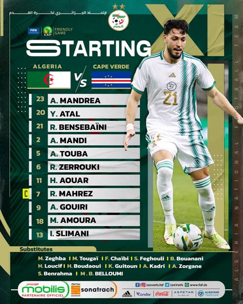ولفت الانتباه في القائمة توظيفُ بلماضي للاعب الجديد أمين غويري أساسيا، مُرتديا القميص رقم “9”.