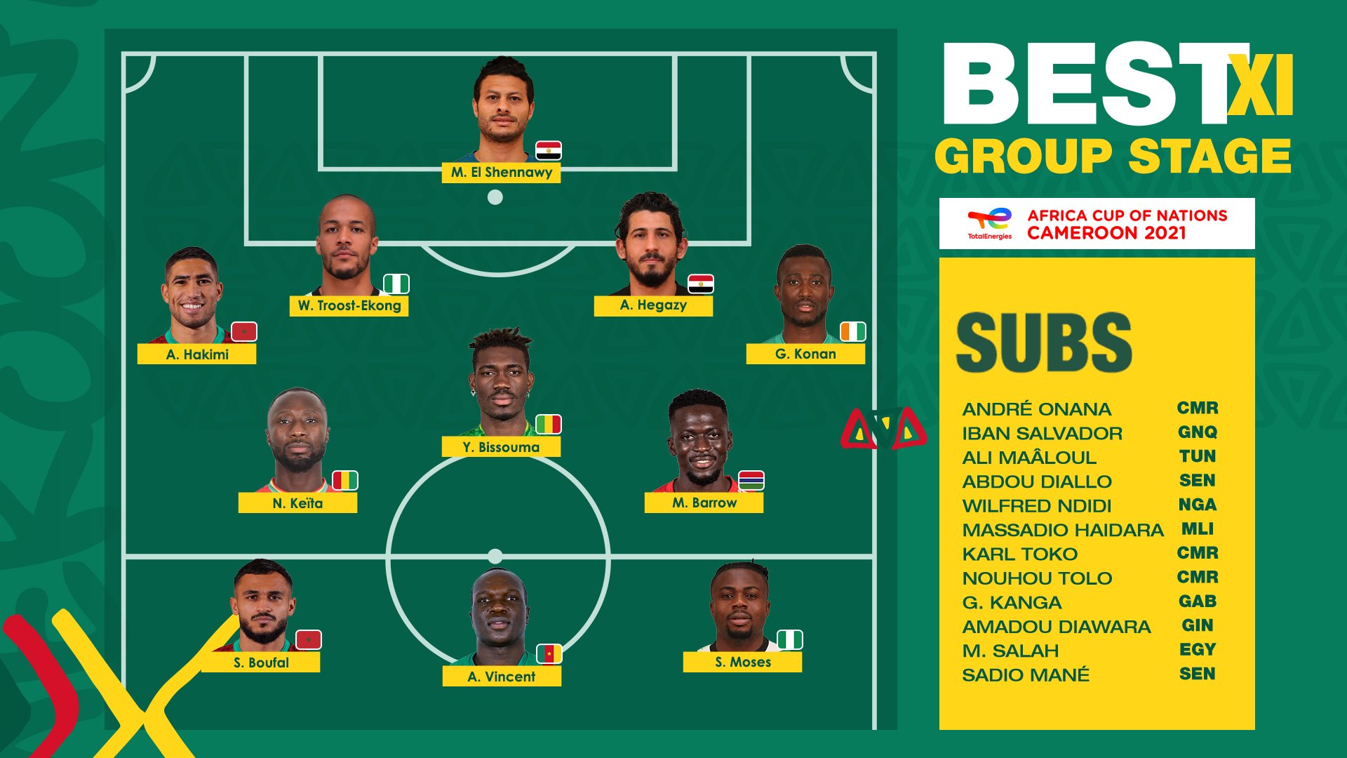 كشف الاتحاد الأفريقي لكرة القدم، السبت عن التشكيلة المثالية لدور المجموعات لكأس أمم أفريقيا الجارية في الكاميرون.