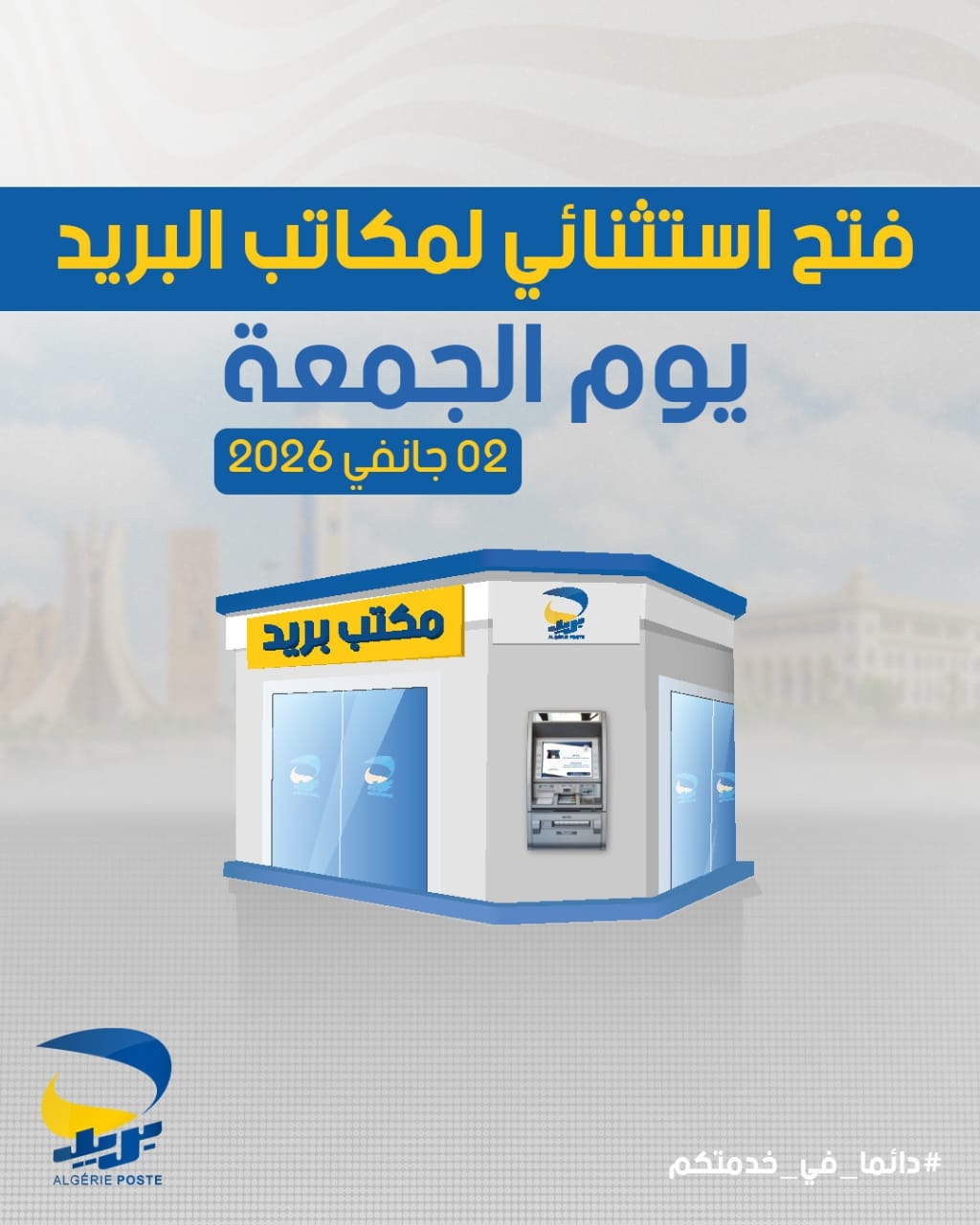 أعلنت مؤسسة بريد الجزائر أنها ستفتح عددًا من مكاتبها البريدية الكبرى استثنائيًا يوم غد الجمعة 2 جانفي 2026، ابتداءً من الساعة الثامنة صباحًا (08:00) إلى غاية منتصف النهار (12:00).