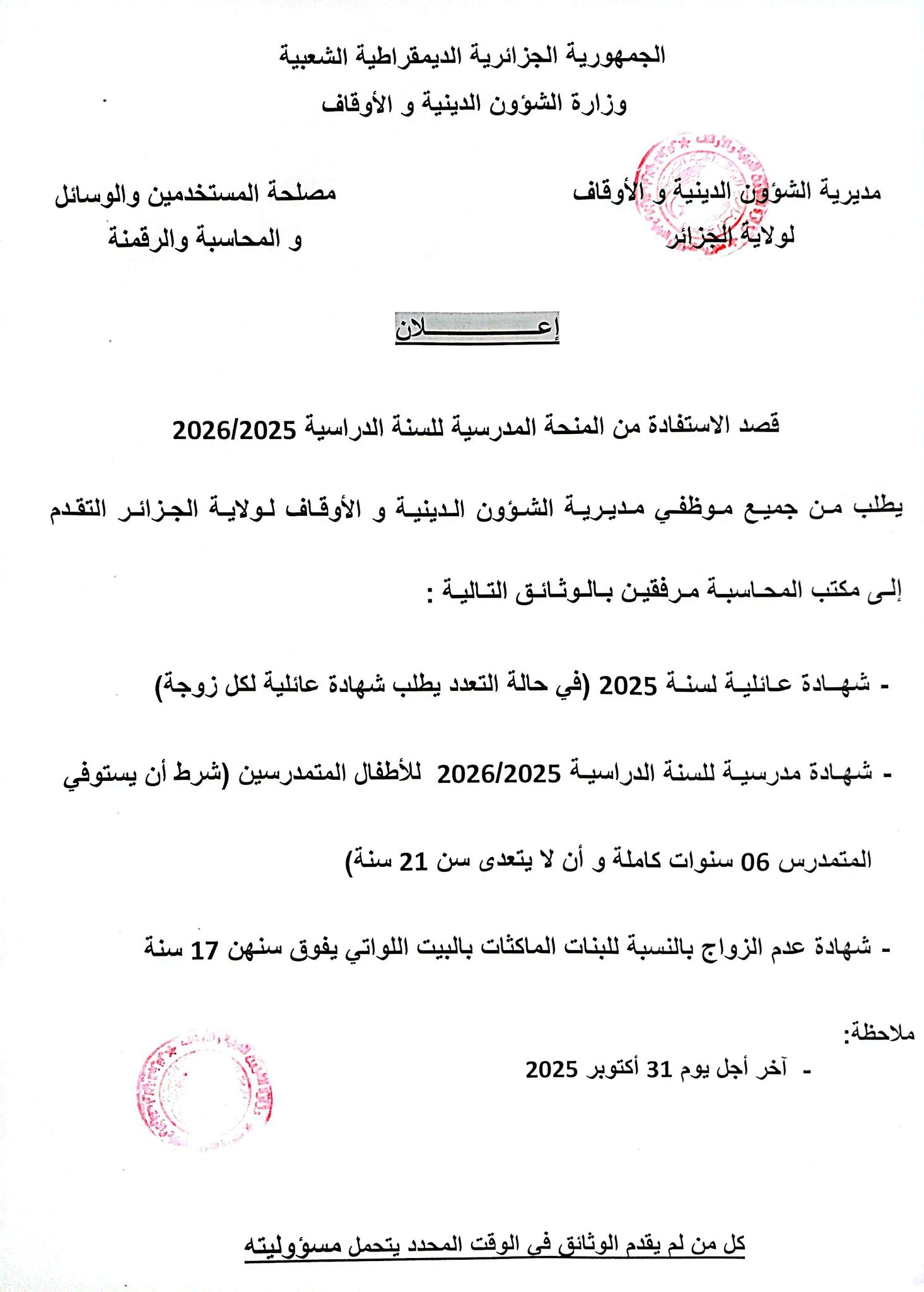 أعلنت مديرية الشؤون الدينية والأوقاف لولاية الجزائر، الإثنين عن فتح باب الاستفادة من المنحة المدرسية الخاصة بالسنة الدراسية 2025/2026، داعية جميع موظفيها إلى التقدم لمكتب المحاسبة مرفوقين بالوثائق المطلوبة.