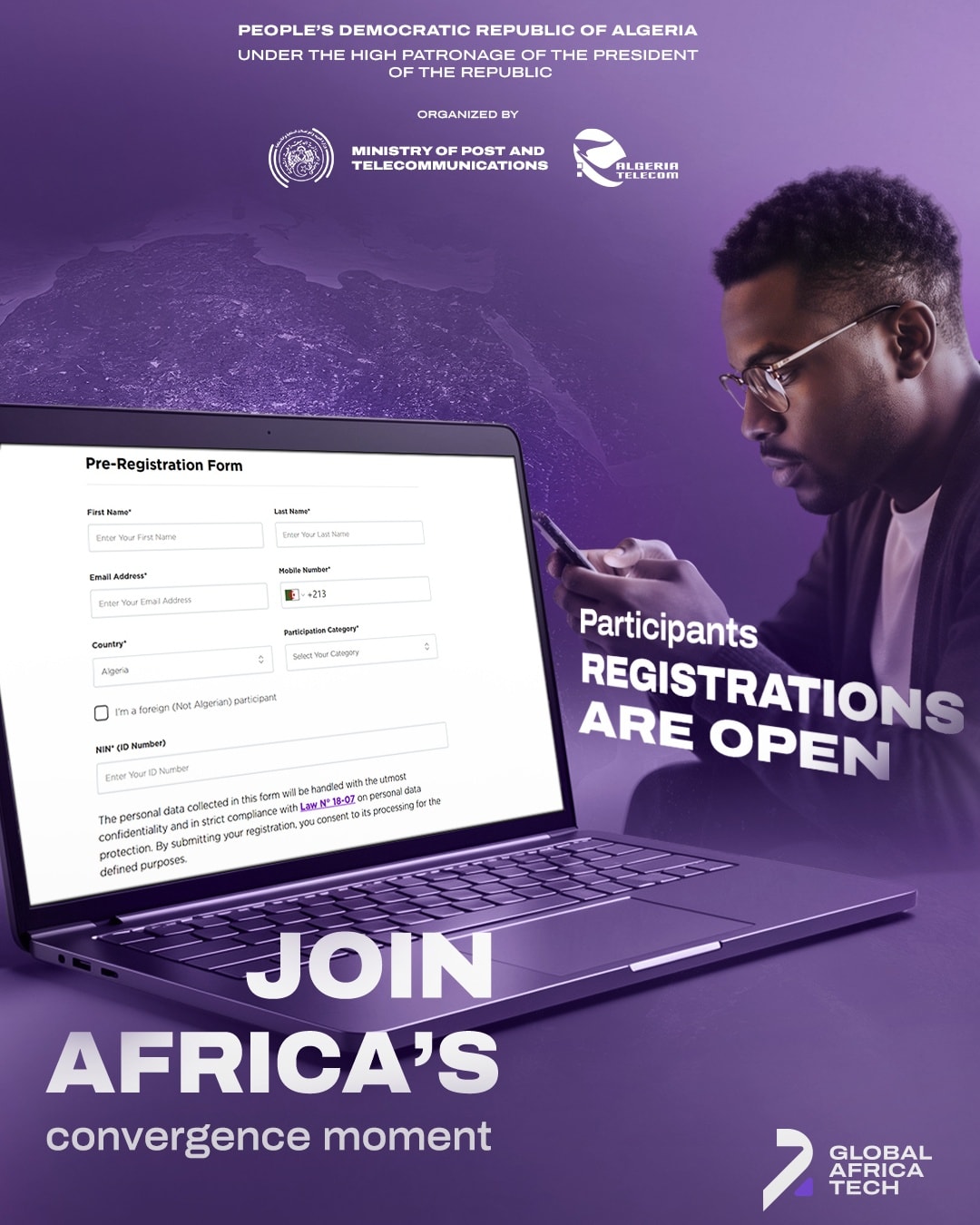 أعلنت وزارة البريد والمواصلات السلكية واللاسلكية عن فتح باب التسجيل للمشاركة في الحدث القاري الرائد في مجال الاتصالات والتكنولوجيا Global Africa Tech 2026، المقرر تنظيمه في الجزائر من 28 إلى 30 مارس 2026 بالمركز الدولي للمؤتمرات عبد اللطيف رحال.