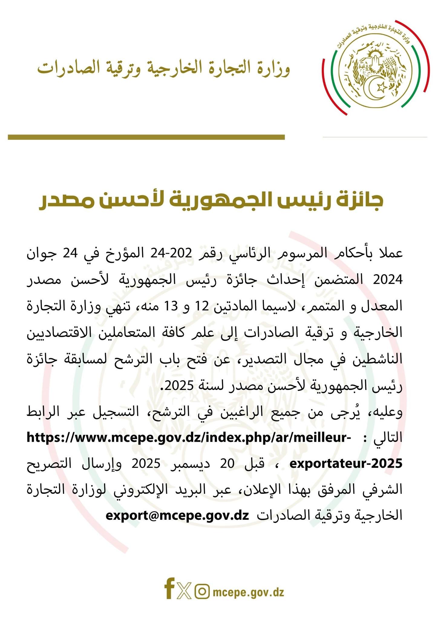 أعلنت وزارة التجارة الخارجية وترقية الصادرات، الخميس، عن فتح باب الترشح لجائزة رئيس الجمهورية لأحسن مصدر لسنة 2025، وذلك عملاً بأحكام المرسوم الرئاسي رقم 202-24 المؤرخ في 24 جوان 2024 المتعلق بإحداث الجائزة، والمعدل والمتمم لاحقاً، لاسيما المادتين 12 و13 منه.