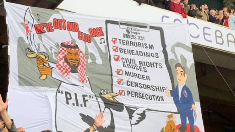 وهاجمت جماهير كريستال بالاس، رابطة الدوري الإنجليزي الممتاز لسماحها بالاستحواذ السعودي على نيوكاسل يونايتد عبر “لافتة” صورت رجلا يرتدي الزي السعودي ويحمل منجلا ملطخا بالدماء.