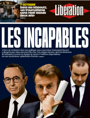 صحيفة ليبيراسيون لم تتردد في تسمية المسؤولين عن الأزمة، حيث صنفت ماكرون، ليكورنو، وزعيم اليمين برونو ريتايو بـ”العاجزين”، ووصفت الأزمة بأنها نتاج إصرار الرئيس على سياسة “لا تعرف التسويات”، ما أغرق البلاد في الفوضى، وسط ردة فعل ضيقة النطاق تقتصر على تكليف ليكورنو بـ “المفاوضات الأخيرة” على منصة عمل غامضة.
