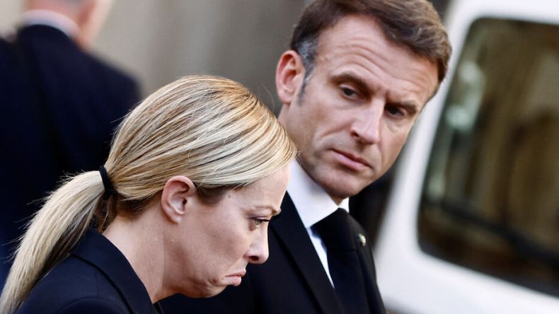 إيمانويل ماكرون ورئيسة الوزراء الإيطالية جورجيا ميلوني في يوم الجنازة الرسمية للرئيس الإيطالي السابق وعضو مجلس الشيوخ جورجيو نابوليتانو في روما، إيطاليا، 26 سبتمبر 2023.