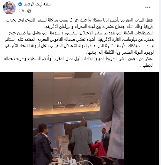 وأرفقت المستشارة الصحراوية منشورها، بمقطع فيديو، يظهر الدبلوماسي المغربي وهو يتلفّظ بكلمات وصفتها بـ”السوقية والبذيئة” في حقّ الممثل الصحراوي.