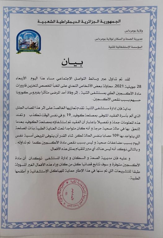 وأوضح المصدر أن إدارة المستشفى تكذب وتفند هذه المعلومات جملة وتفصيلا باعتبار أن الفقيد تم استشفاؤه بمصلحة كوفيد بعدما التحق بها في حالة صحية حرجة، مشيرة إلى ان المريض توفي إثر مضاعفات صحية وليس بسبب نقص مادة الأكسجين.