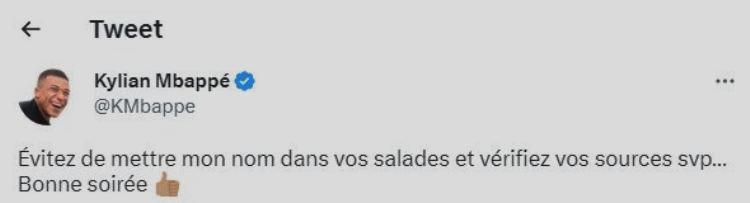 ونشر المهاجم مبابي تغريدة عبر منصّة التواصل الاجتماعي”تويتر”، ينفي فيها هذه المزاعم، ويقول: “تجنّبوا إدراج اسمي في قضاياكم. تحققّوا من المصدر من فضلكم. مساء الخير”.