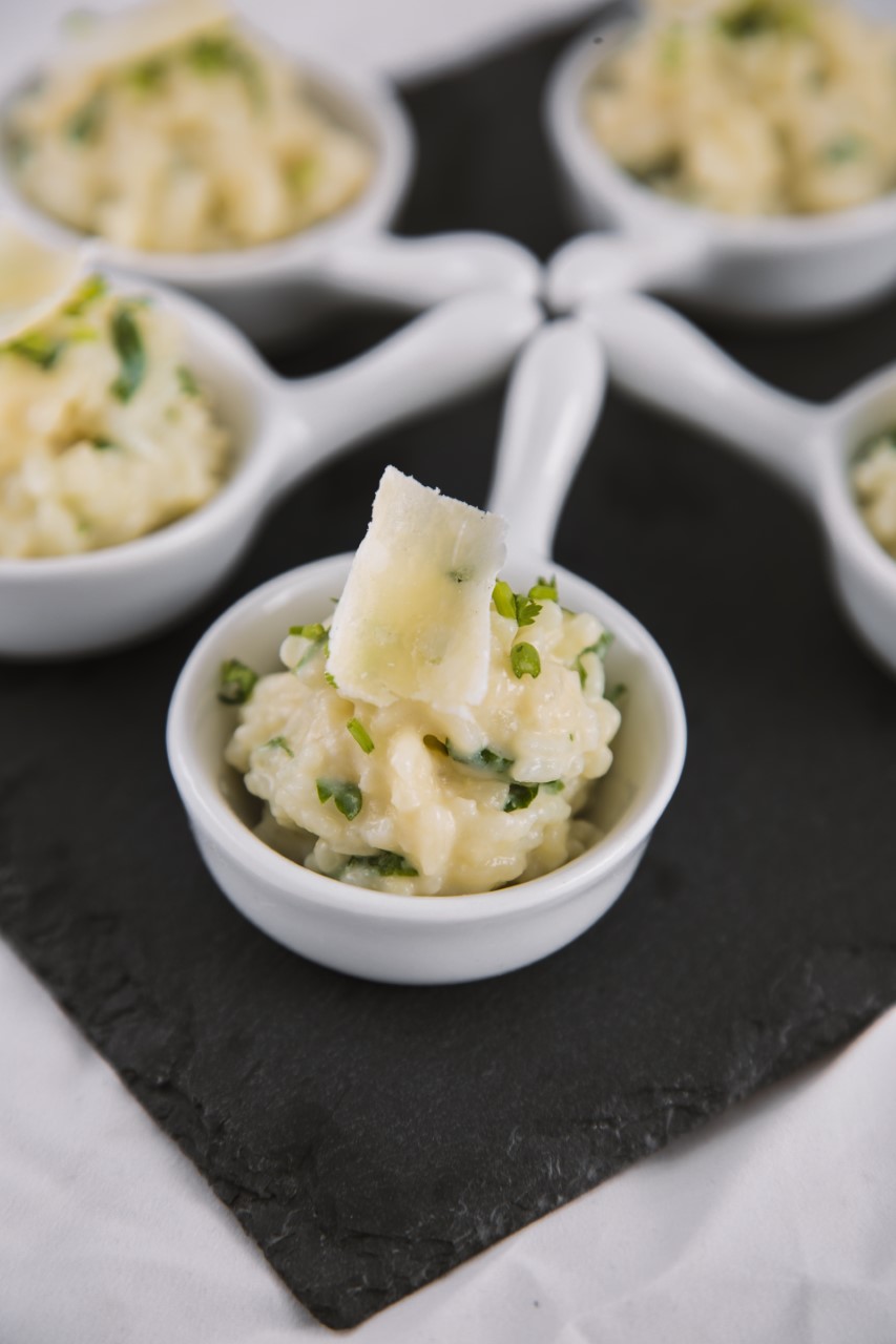 في قدر نفرغ الحليب ونضيف له الأرز والملح ونضعه فوق نار هادئة ونتركه يطهى، ثم نضيف له الزبدة و نحرك باستمرار حتى ينضج الأرز، ثم نضيف له الجبن الأبيض وجبن البارميزان ونخلط، ثم نضيف البقدونس، وفي الأخير نضعه في قوالب التقديم و نزينه بجبن البارميزان كما هو موضح في الصورة.