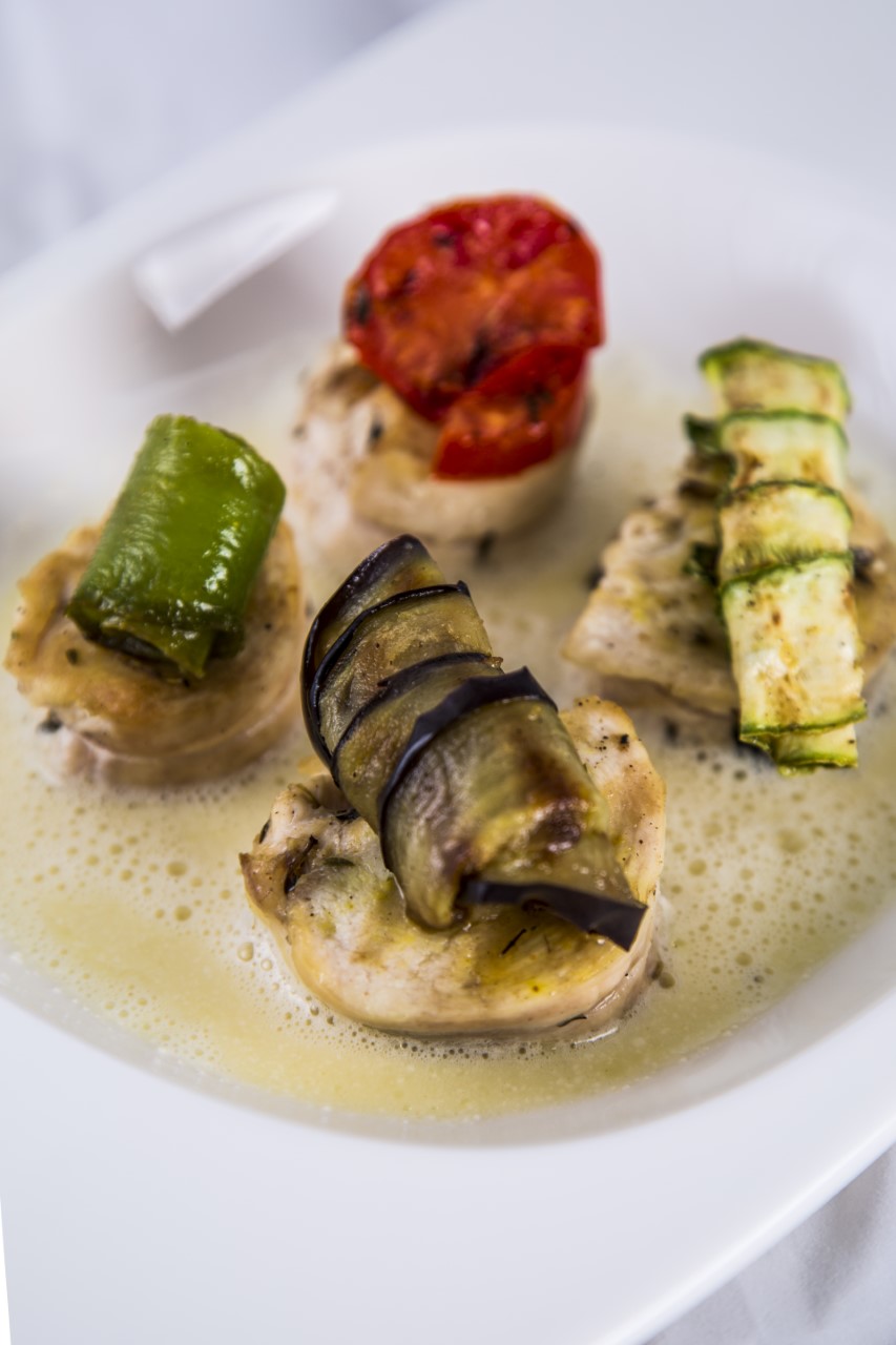 نأخذ صدر الدجاج ونقطعه على شكل دوائر، ثم نسخن ملعقة زيت في مقلاة ونحمر الدجاج الذي نرشه بقليل من الملح والفلفل الأسود والزعتر، عندما يتحمر ننزعه من النار ونضعه في صينية فرن و نغطيه بورق الالمنيوم وندخله الفرن ليواصل الطهي، في ذلك الوقت نقطع الخضر إلى شرائح رفيعة ثم نسخن ملعقة زيت في مقلاة ونقلي شرائح الخضرالمرشوش عليها الملح والفلفل الاسود ونتركها على جنب، ثم نحضر الصلصة كالتالي: في قدر نضع الحليب ونتركه يسخن جيدا، ثم نضيف له الجبن والملح والفلفل الأسود ونخلط، ثم نضيف الزبدة ونواصل الخلط، ثم ننزعه من النار ونضيف له البيض ونخلط جيدا، ثم في الأخير نضيف جوزة الطيب، نأخذ صحن التقديم ونضع الصلصة ثم قطع الدجاج ونضع فوق كل قطعة دجاج قطعة خضر ملفوفة كما هو موضح في الصورة.