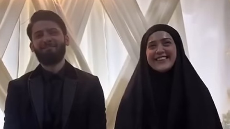 يظهر في المقطع الذي اجتاح الشبكات وحصد تفاعلا واسعا، الشابين جالسين بملابس عادية، في مكان مزين خاص بالعرسان داخل قاعة حفلات، حيث ترتدي الفتاة جلبابا أسودا والشاب بدلة سوداء أيضا.