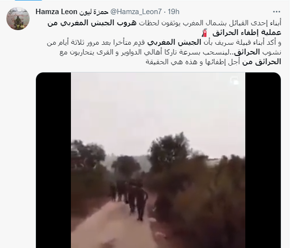 تداول مستخدمون لمواقع التواصل الاجتماعي، مقطع فيديو يظهر هروب عدد من أفراد الجيش المغربي، من عمليات إخماد النيران التي نشبت في شمال البلاد.