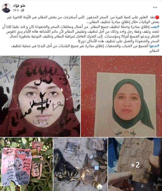 وأظهرت مقاطع الفيديو والصور التي غزت منصات التواصل الاجتماعي، منذ يوم الجمعة، أعدادا لا حصر لها من الأعمال السحرية التي استخدمت فيها طلاسم، ألعاب أطفال، شعر، ملابس داخلية، قطع قماش، فوط صحية، وغيرها من الأقفال، الدبابيس، بيض، عظام وجلود حيوانات، وحتى بشرا موتى!