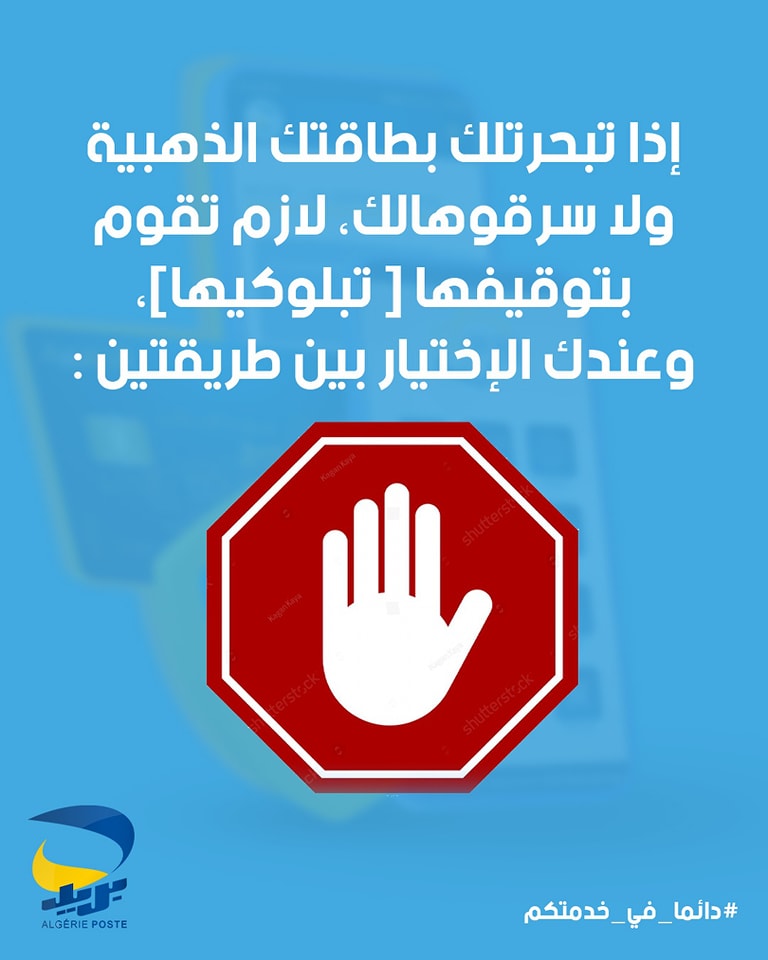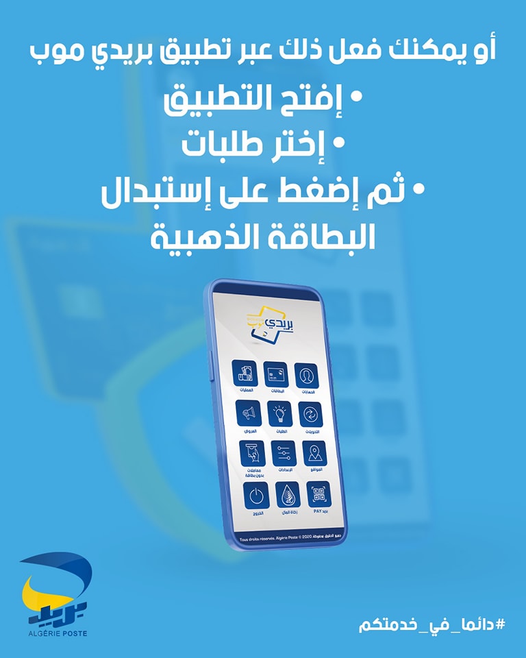 وأشارت المؤسسة إلى أن توقيف البطاقة يمكن أن يتم بإحدى طريقتين: إما بالتوجه مباشرة إلى أحد مكاتب البريد، أو عن طريق تطبيق “بريدي موب”، حيث يكفي فتح التطبيق، اختيار قسم “الطلبات”، ثم الضغط على خيار “استبدال البطاقة الذهبية”.