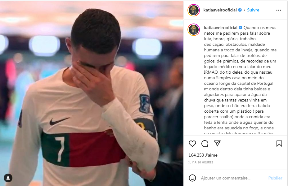 ونشرت أفييرو عبر حسابها على إنستغرام، صورة “الدون” وهو يبكي، بعد الخسارة أمام المغرب بهدف دون رد، وكتبت: “عندما يطلب مني أحفادي الحديث عن النضال والشرف والمجد والعمل والتفاني والعقبات والشر البشري مقابل الحسد، عندما يطلبون مني التحدث عن الجوائز والأهداف والجوائز وسجلات الإرث غير المسبوق، سأتحدث عن أخي، عمهم”.