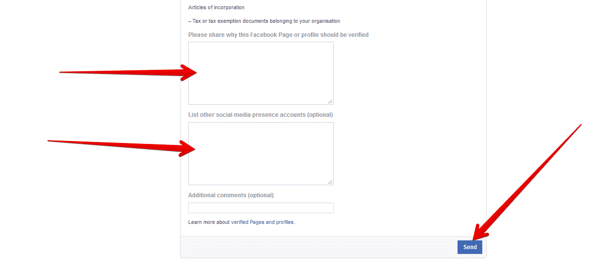 - 6/ في نهاية النموذج ستجد مربعين يجب أن تكتب في الأول بضع عبارات توضح سبب ضرورة توثيق الصفحة. كن محددًا هنا حول كيف يمكن أن يفيد عملك مستخدمي فيسبوك إذا كان ذلك ممكنًا