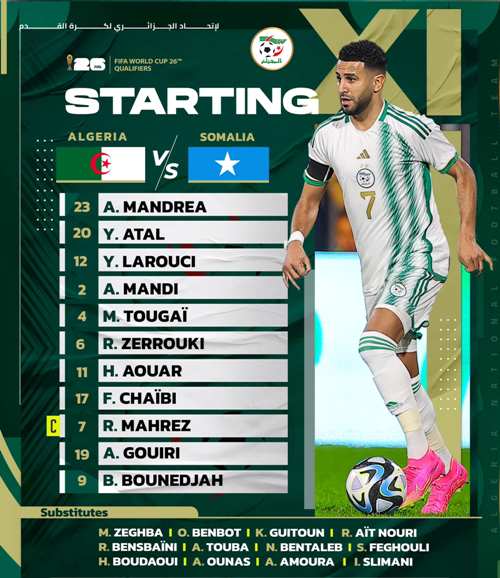 قائمة اللاعبين الأساسين الجزائريين في مواجهة الصّومال