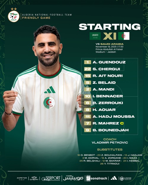 قائمة اللاعبين الأساسيين للجزائر في مواجهة السعودية