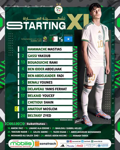 قائمة اللاعبين الأساسيين لِأشبال “الخضر” أمام الصومال