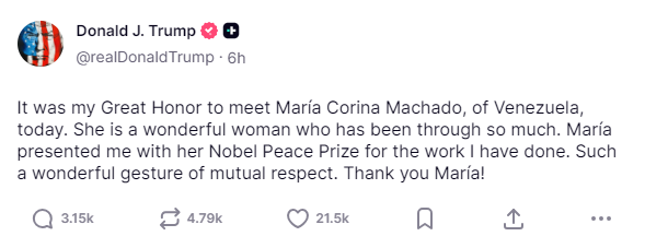 وكتب ترامب في منشور على وسائل التواصل الاجتماعي مساء الخميس: “قدمت لي ماريا جائزة نوبل للسلام تقديراً للعمل الذي قمت به. يا لها من لفتة رائعة تعكس الاحترام المتبادل. شكراً لكِ يا ماريا!”