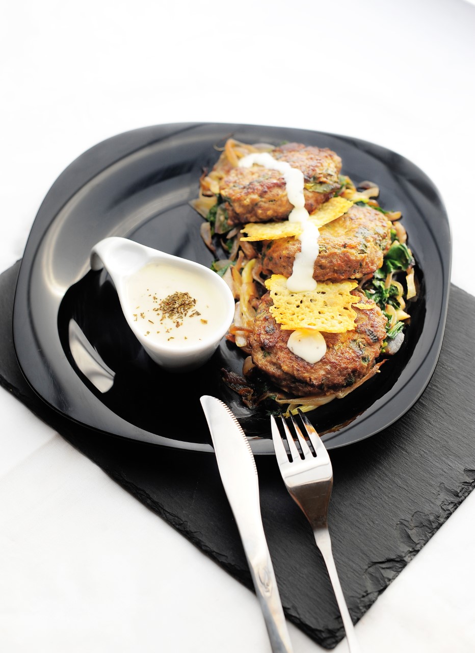 Galettes de viande hachée aux épinards et sauce fromage basilic