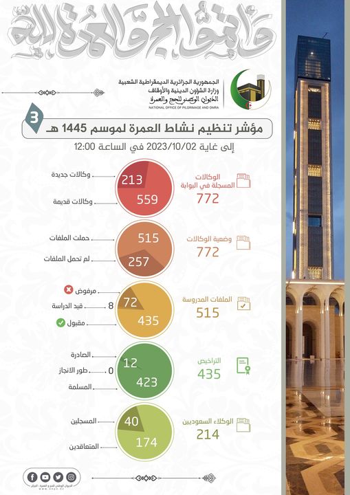 أعلن الديوان الوطني للحج والعمرة، الإثنين، عن قبول 435 ملف وكالة سياحية لتنظيم العمرة لموسم 1445 هـ.