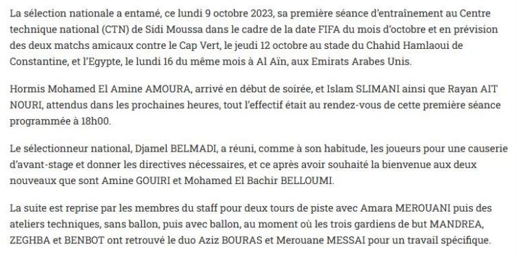 نُوضّح هذا الأمر، لِأن خلية الإعلام التابعة لـ “الفاف” سقطت في المطبّ نفسه بِشأن ريان آيت نوري، لمّا قالت في بيان لها سهرة الإثنين، إنه يُنتظر قدوم مدافع نادي ولفرهامبتون الإنجليزي إلى الجزائر في الساعات القليلة المقبلة (طالع المنشور المُفرنس الثاني والأخير/ ما بين السطرَين الرّابع والسّادس). قبل أن تنشر يومَين من بعد بيانا آخر تُؤكّد غيابه الرّسمي.
