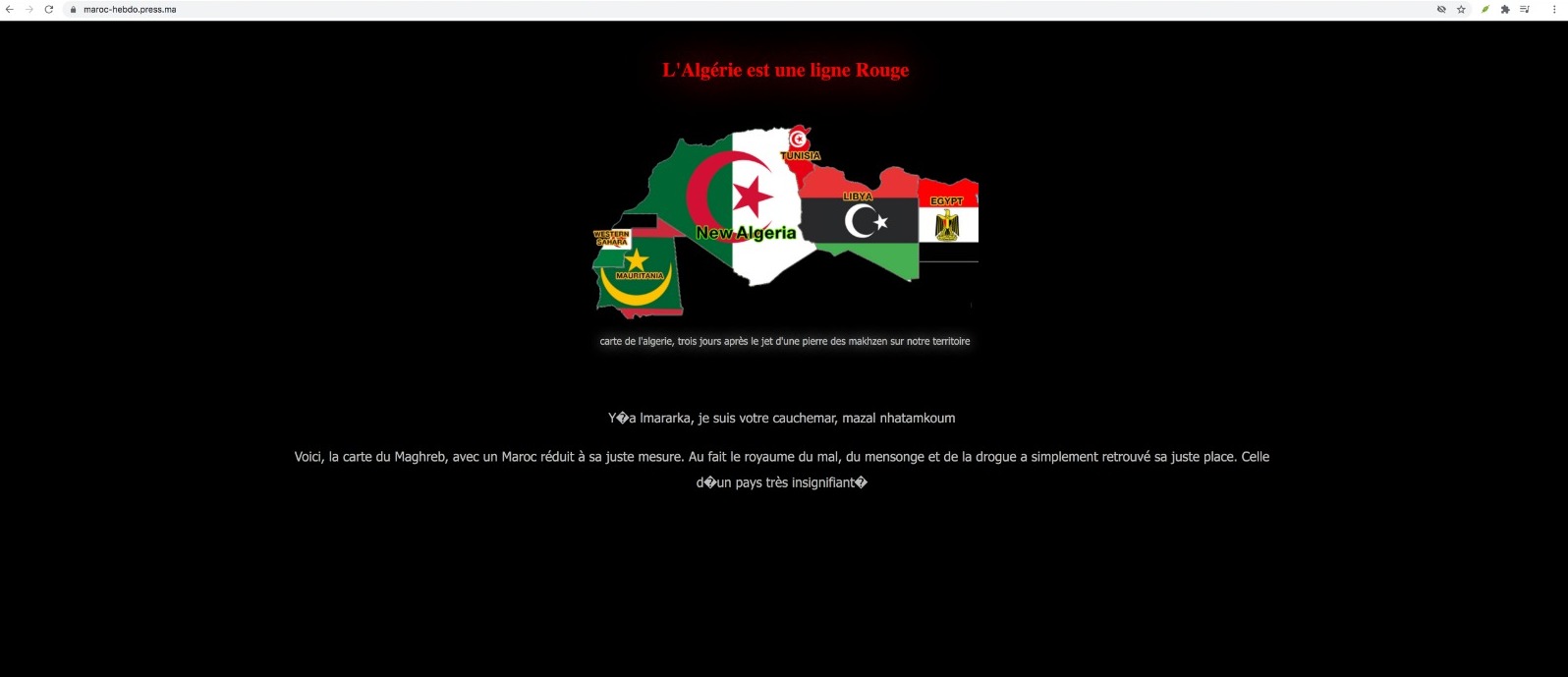 وكتب القراصنة عبارة: “هكذا ستكون خريطة الجزائر مع أول خطوة للمساس بأرضنا”، فيما يبدو أنه رد على قيام المجلة قبل أيام بوضع خارطة على صفحتها الرسمية تضم أراض جزائرية إلى المغرب في استفزاز مخزني واضح.