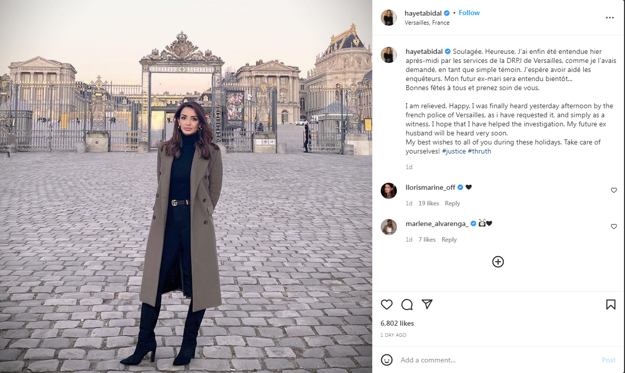 وقالت حياة عبر حسابها على إنستغرام: “أشعر براحة الآن، أخيراً قدمت شهادتي أمام شرطة فرساي وبالطريقة التي أردتها كشاهدة. آمل أن أكون ساهمت في التحقيق وزوجي، المطلق مستقبلاً، سيدلي بشهادته قريباً جداً. كل التوفيق لكم في موسم الأعياد”.
