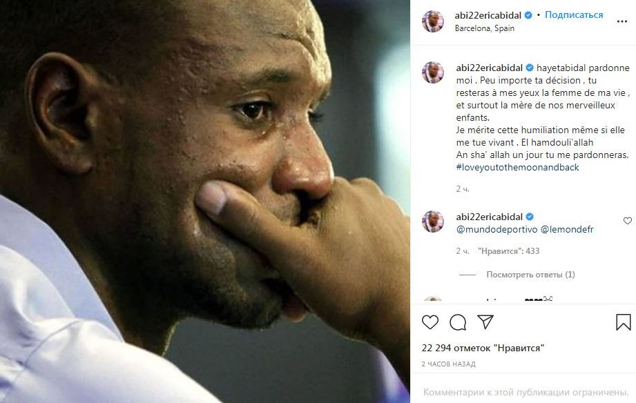 Eric Abidal sur Instagram : « Hayet, pardonne moi. Peu importe ta décision, tu resteras à mes yeux la femme de ma vie, et surtout la mère de nos enfants. Je mérite cette humiliation même si elle me tue vivant. El Hamdulillah. In sha’ Allah, un jour tu me pardonneras. » pic.twitter.com/ZgSEaiwwat
