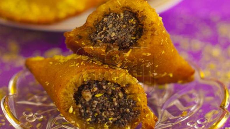في وعاء نضع الفرينة، السميد، السكر، الخميرة، الملح والنشاء ثم نخلط  كل المقادير، نضيف الكوب الأول من الماء ونخلط جيدا ثم نضيف الكوب الثاني ونواصل الخلط مع  إضافة عطر البرتقال حتى نتحصل على عجينة سائلة، نتركها ترتاح مدة نصف ساعة، نسخن المقلاة جيدا وندهنها بقليل من الزيت ثم بواسطة ملعقة خاصة بسكب الحساء نقوم بسكب كمية قليلة من العجينة لكي نتحصل على دوائر من العجينة صغيرة الحجم وبمجرد ملاحظة أنه يمكن نزع العجينة ننزعها من النار ونضعها في منديل لتحافظ على الحرارة ثم نقوم بحشو العجينة التي تكون على شكل دائري، نضع في النصف كمية من الحشو و نطوي عليها النصف الآخر، نقوم بغلقها ثم قليها في الزيت الساخن، ننزعها و نتركها تقطر جيدا من الزيت ثم نغمسها في العسل و نزينها بالفستق.
