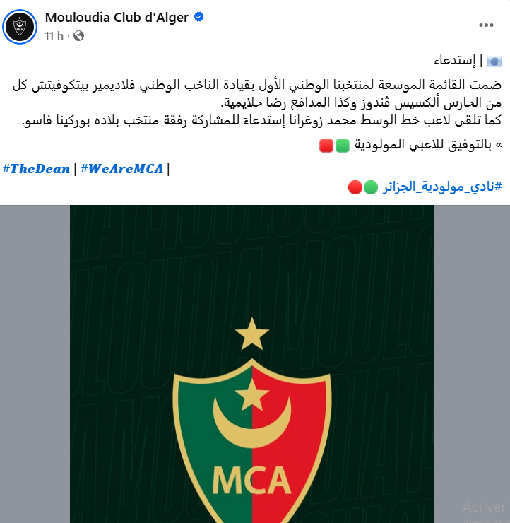 وكشفت الصفحة الرسمية لفريق مولودية الجزائر، عن استدعاء بيتكوفيتش للثنائي ضمن القائمة الموسعة، للمنتخب الوطني، الذي سيدخل في تربص في شهر سبتمبر، لخوض لقاءين من تصفيات كأس العالم 2026.