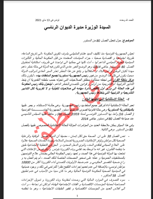 ونشر موقع “ميدل إيست آي” يوم 23 ماي 2021، وثيقة سرية مسربة من الرئاسة التونسية عما أسماه خطة للرئيس قيس سعيد نحو “دكتاتورية دستورية”.