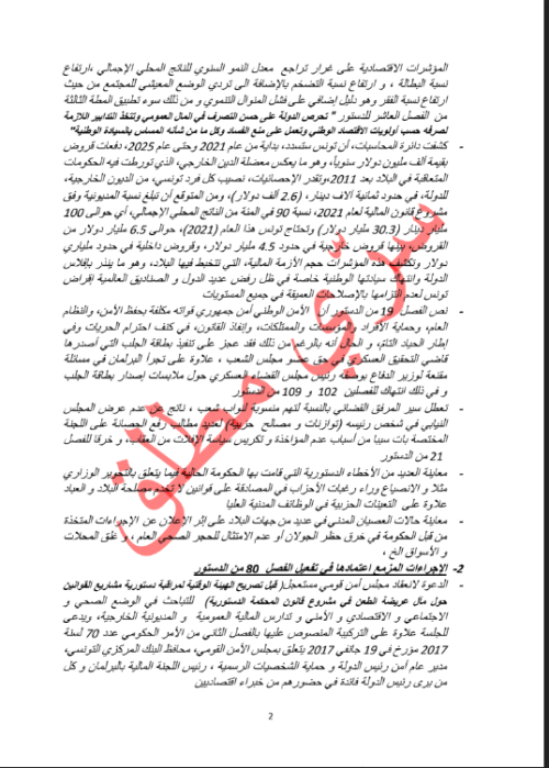 وأوضحت الوثيقة كيف سيٌفعل الرئيس قيس سعيد مادة في الدستور تمنحه -في حالة الطوارئ الوطنية- سيطرة كاملة على الدولة”.