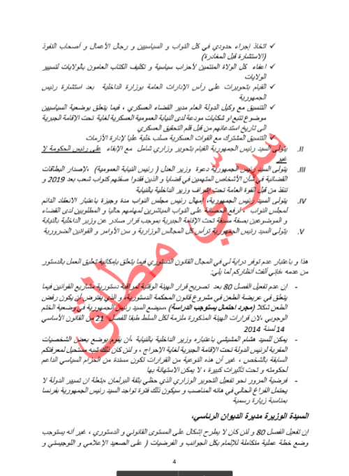 بعد ذلك حسب الوثيقة، “سيعلن الرئيس سعيد للحاضرين، الذين من بينهم رئيس الوزراء هشام المشيشي ورئيس البرلمان زعيم حزب النهضة راشد الغنوشي، أنه سيفعّل الفصل 80 من الدستور الذي يسمح للرئيس بالاستيلاء على السلطات في حالة طوارئ وطنية”.