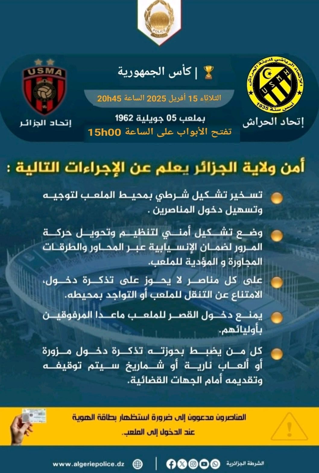 أعلنت شرطة العاصمة عن جملة من الإجراءات والتدابير المتخذة، لتأمين مباراة نصف نهائي كأس الجزائر، التي ستجمع بين اتحاد العاصمة واتحاد الحراش.
