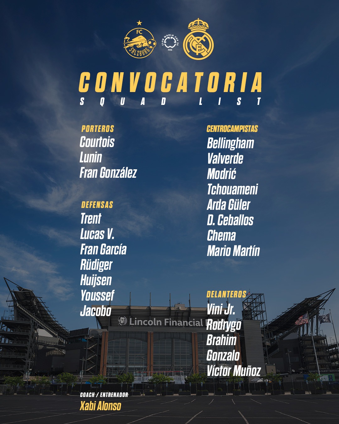 أعلن المدرب تشابي ألونسو قائمة ريال مدريد استعدادا لمواجهة ريد بول سالزبورغ النمساوي، لحساب الجولة الثالثة والأخيرة من دور المجموعات بكأس العالم للأندية 2025.