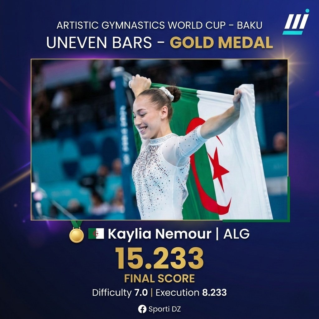 توّجت البطلة الجزائرية كيليا نمور بالميدالية الذهبية ضمن منافسات جولة كأس العالم للجمباز بباكو الأذربيجانية.