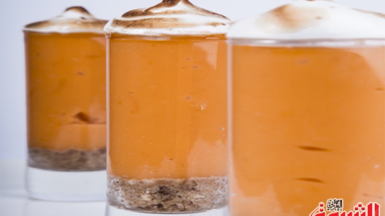 المقادير:·01 كوب حليب من نوع “LOVELY”·عصير حبة برتقال·04 صفار بيض·سكر حسب الذوق·25 غ زبدة·05 ملاعق قهوة “مايزينة”· بياض حبة بيض·04 ملاعق كبيرة سكر عادي· بسكويت مرحي· ملعقة كبيرة زبدة ذائبة