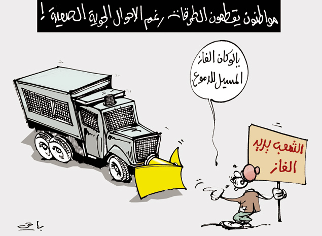 هذا داير مظاهره وحدو و يتكلم باسم الشعب و عندما شاف كاسحة الثلوج حسبها شاحنة قوى مكافحة الشعب و خاف و دوُر اللافته اٍلى الوراء حتى لا يقرؤونها ثم يشير بأصبعه الينا نحن القراء و كأنه يقول لهم هؤلاء و لست أنا ..