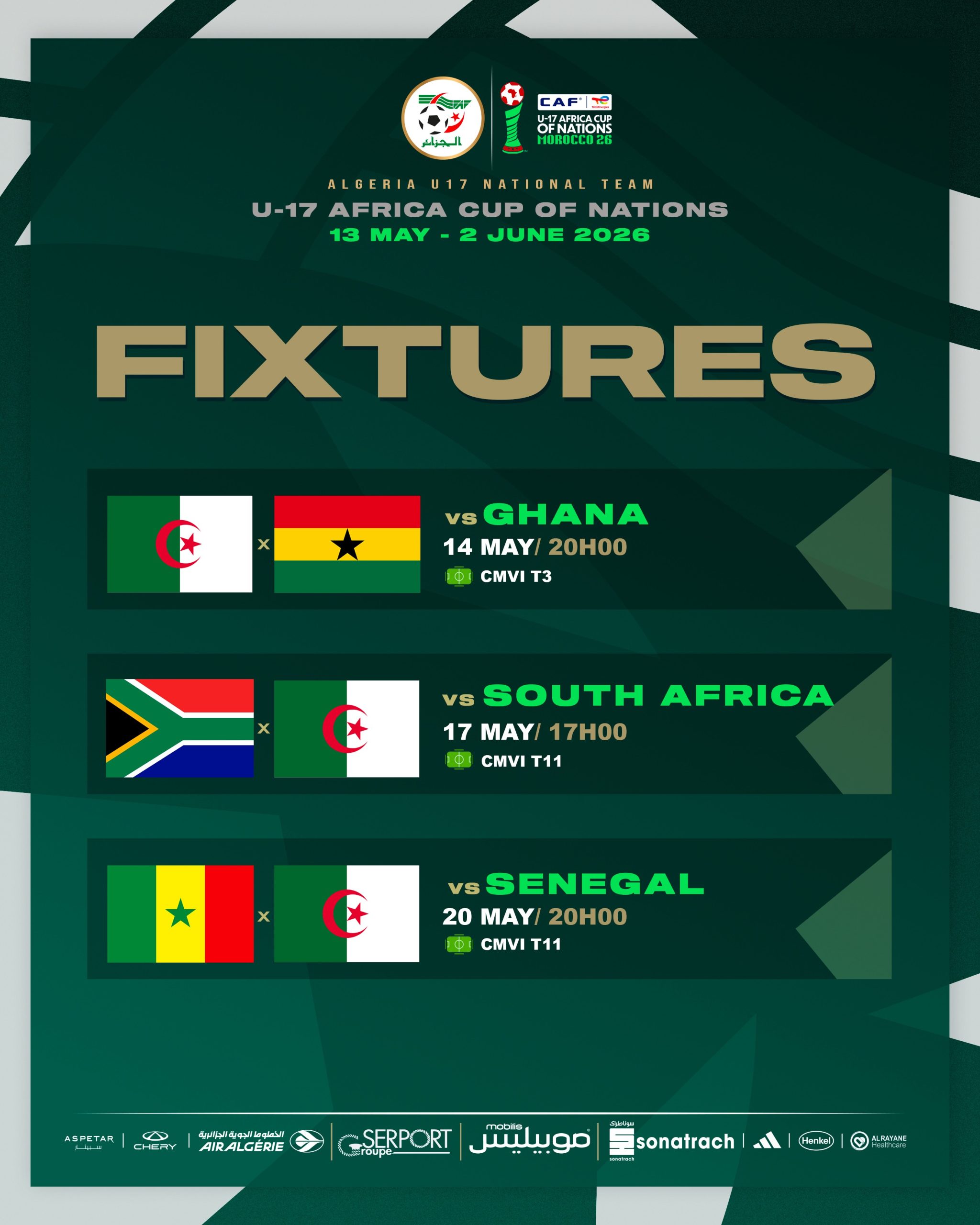 ويواجه “الخضر” في المباراة الثانية منتخب جنوب إفريقيا، يوم 17 ماي، بداية من الساعة الخامسة مساءً.