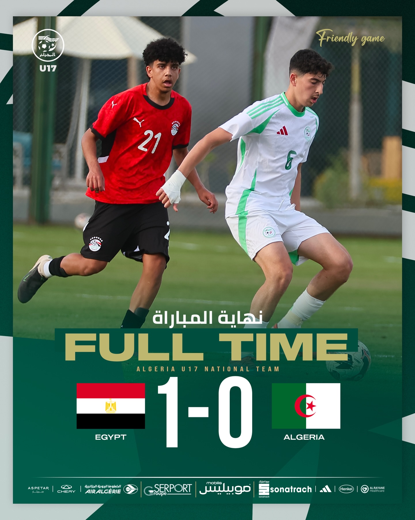 ولعبت المباراة بمركز المنتخبات الوطنية التابع للاتحاد المصري، وشهد اللقاء أداء متوازنا من الجانبين، حيث أهدر “الخضر” عدة فرص سانحة، قبل أن ينجح المنتخب المصري في استغلال إحدى محاولاته في اللحظات الأخيرة، مسجلا الهدف الوحيد في المباراة.