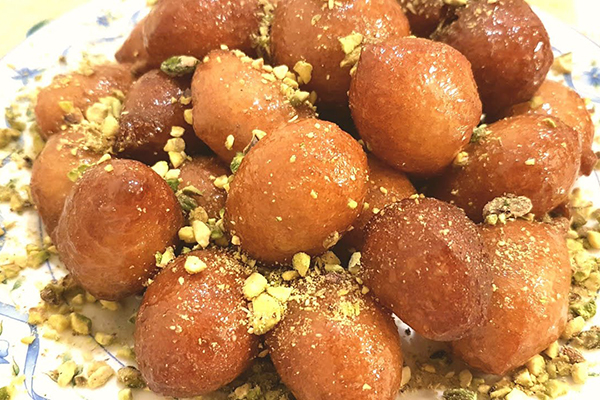 كأس فرينة، نصف ملعقة صغيرة خميرة فورية، نصف ملعقة صغيرة سكر، نصف ملعقة كبيرة مايزينة، ربع ملعقة صغيرة خميرة الحلوى، رشة ملح، ¾ كوب ماء فاتر، ملعقة صغيرة ماء زهر، زيت للقلي، شاربات، فستق مطحون للزينة.